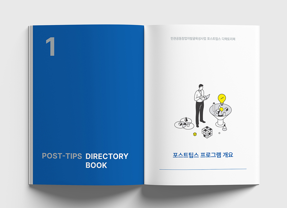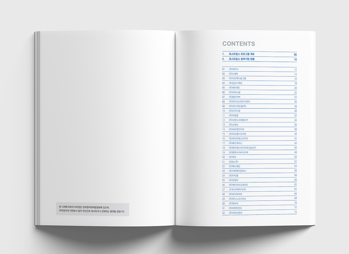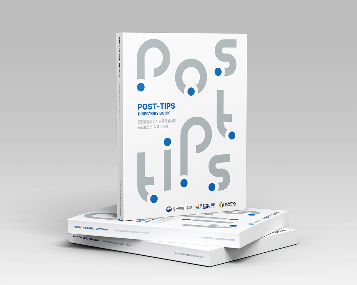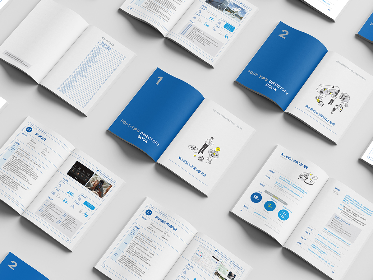기술력과 성장 가능성을 인정받은 기업을 지원하는프로그램인 '포스트팁스' 디렉토리북을 진행했습니다.타이포의 원형은 팁스 프로그램을 통해 검증된성장하고 발전하는 다양한 기업을 의미하며신뢰와 안정감을 주는 블루 계열을 사용하여디자인하였습니다.