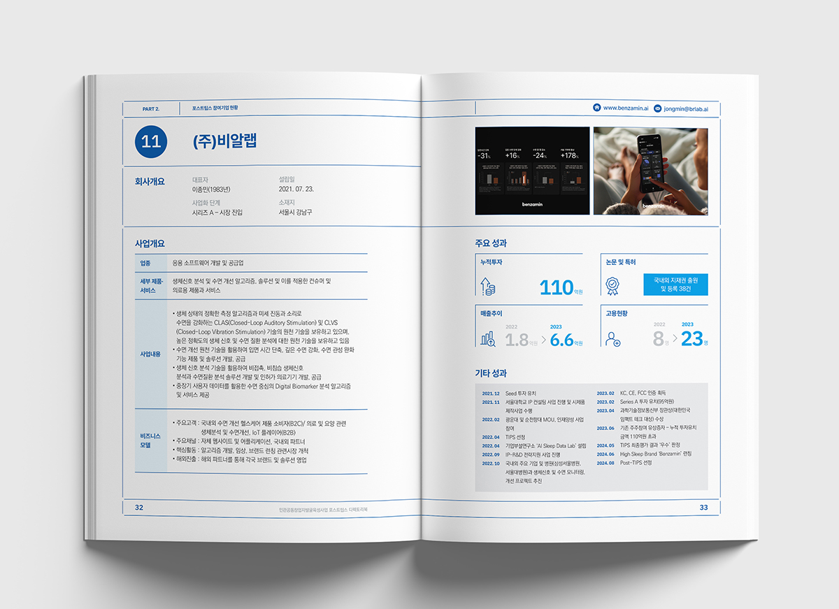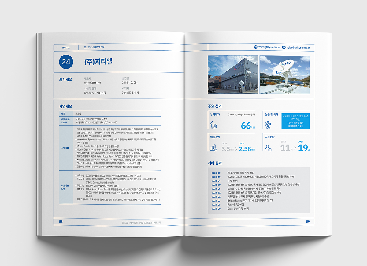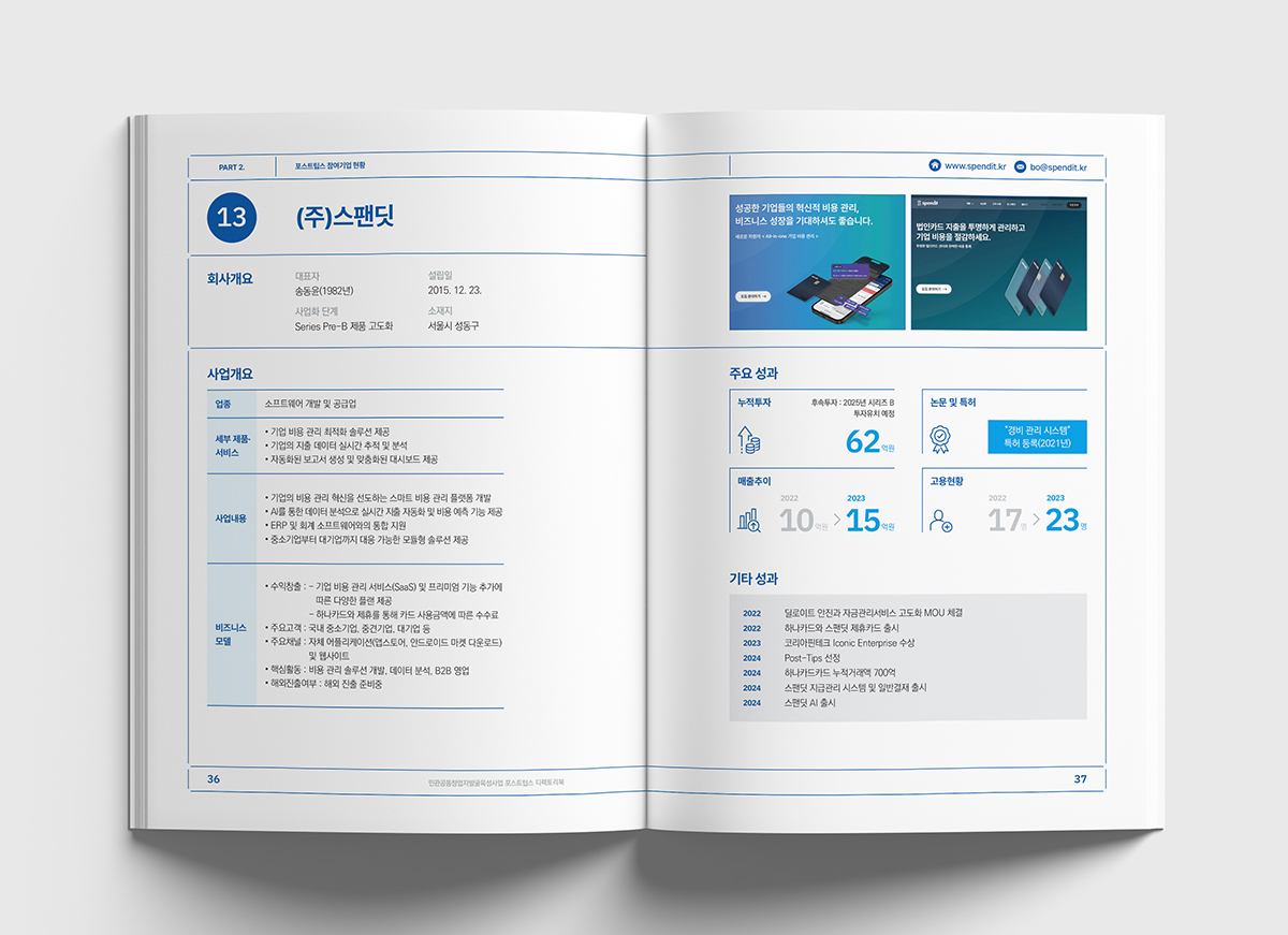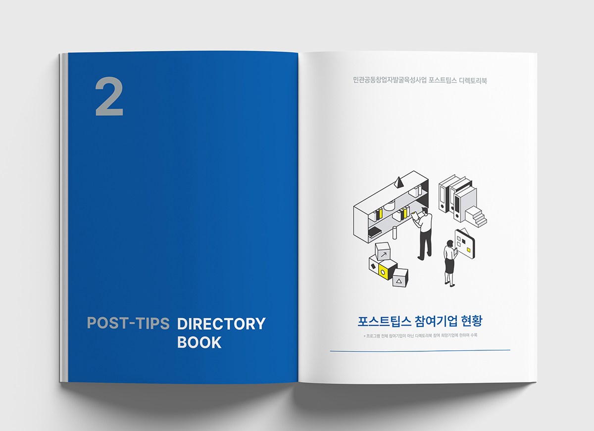 기술력과 성장 가능성을 인정받은 기업을 지원하는프로그램인 '포스트팁스' 디렉토리북을 진행했습니다.타이포의 원형은 팁스 프로그램을 통해 검증된성장하고 발전하는 다양한 기업을 의미하며신뢰와 안정감을 주는 블루 계열을 사용하여디자인하였습니다.