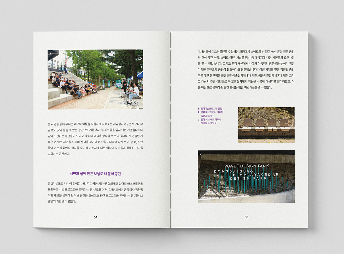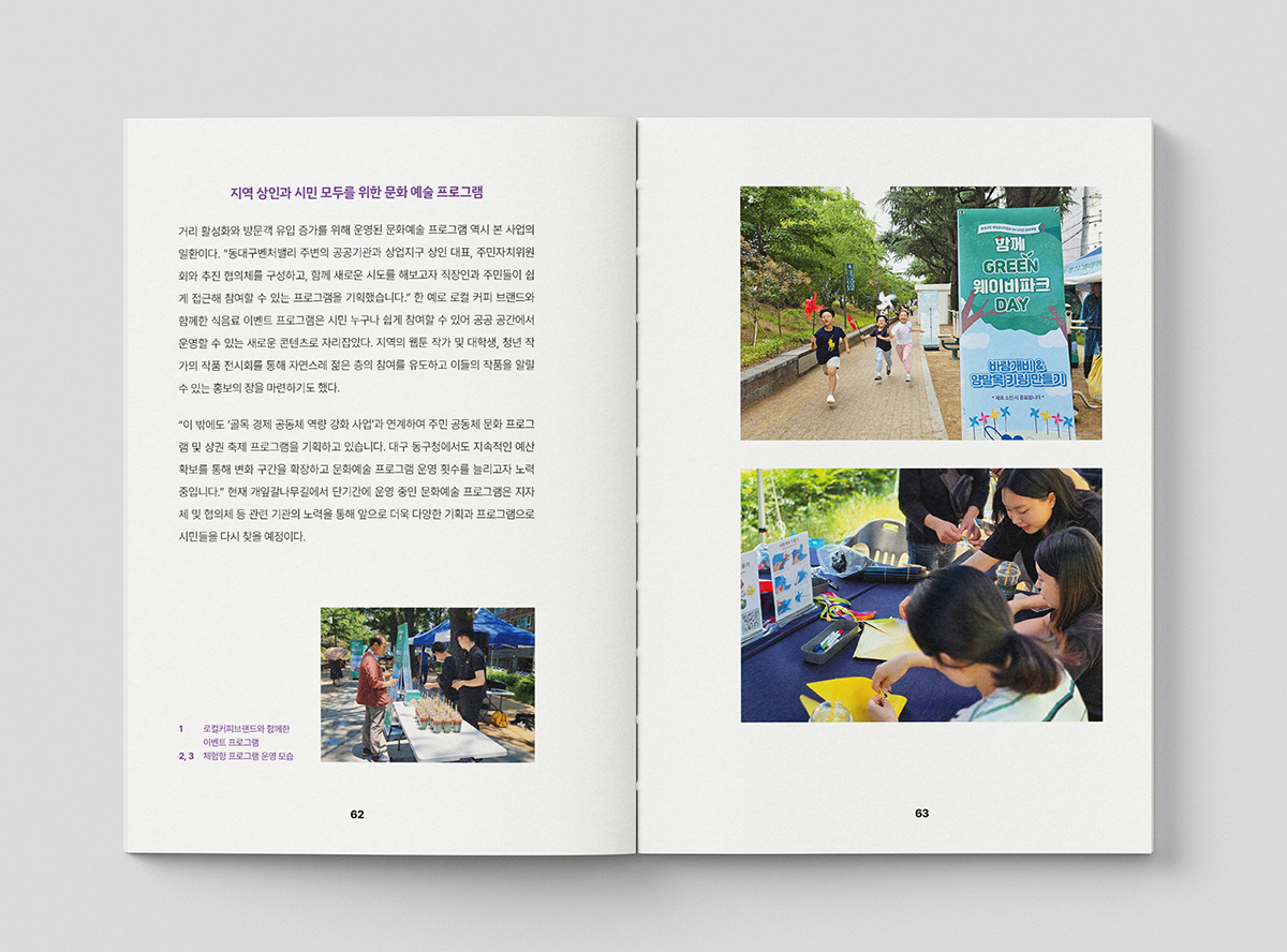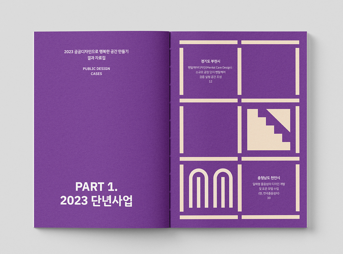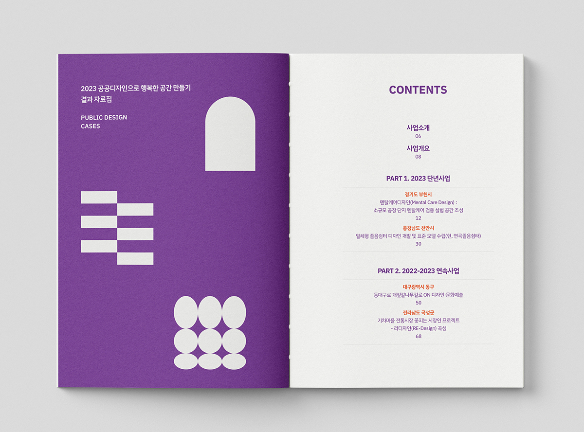 2023 공행공 결과 자료집을 진행했습니다.공행공 사업의 체계적인 시스템 안에서 이루어진기관과 지역 간의 협력과 조화를 정렬된 선으로표현하고 각 지역의 시설물을 그래픽화하여공공디자인을 통한 지역 정체성 확립을 강조했습니다.