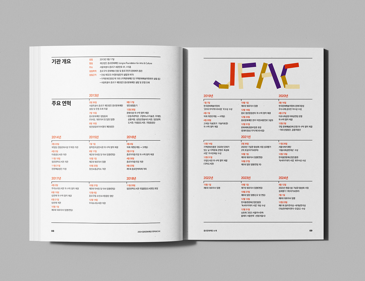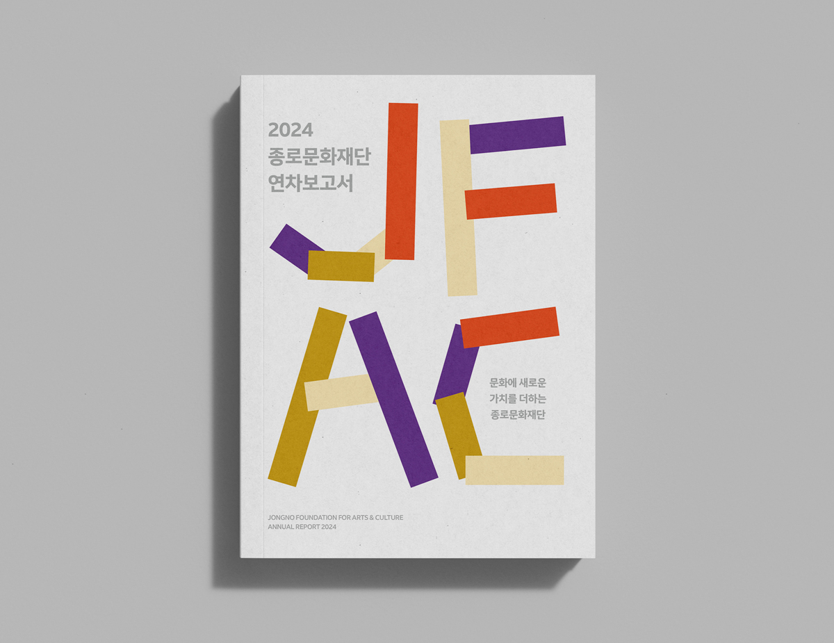 ‘JFAC’을 조형적으로 배치하여 문화예술의역동성과 다양성을 강조했으며, 재구성된 타이포그래피는각기 다른 예술과 문화가 모여 새로운 가치를 창출하는 과정을상징합니다. 또한, 컬러 구성은 종로문화재단이 풍성한예술 경험을 제공하는 기관임을 시각적으로 표현했습니다.